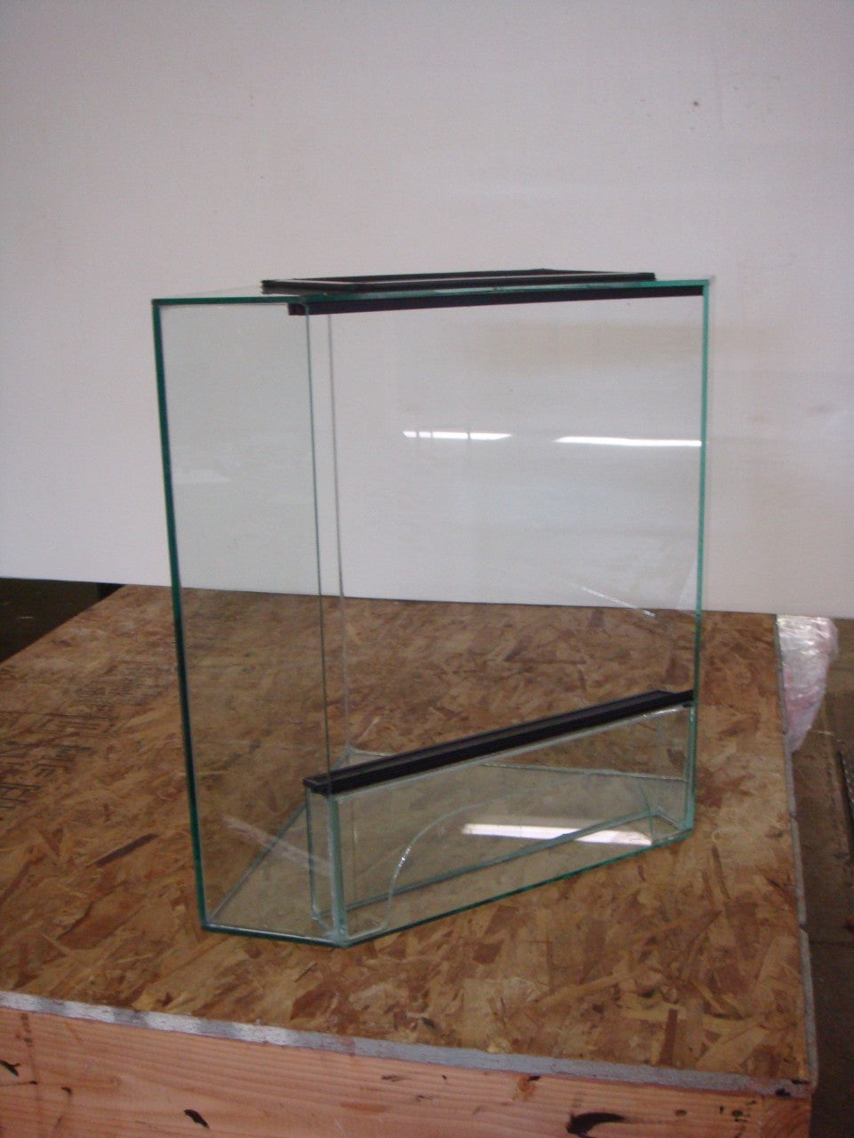 A space saving corner glass terrarium, this 12"x12"x18" is designed to be used as a single unit in corners or as four units together to create a stunning column effect with clear viewing from all angles. This size is ideal for multiple species of frogs, geckos, lizards, and snakes. Tall substrate barrier allows for water section or deep natural filtration layer. Substrate Dam- 6". The standard style of screen top is for use with a majority of reptiles. Dendro-Style comes with a 3-5″ screen top for ventilation set 2″ from the front of the terrarium to reduce humidity loss for humidity sensitive species. Misting and drainage holes can be drilled for an additional charge. Hand made in Maine USA.