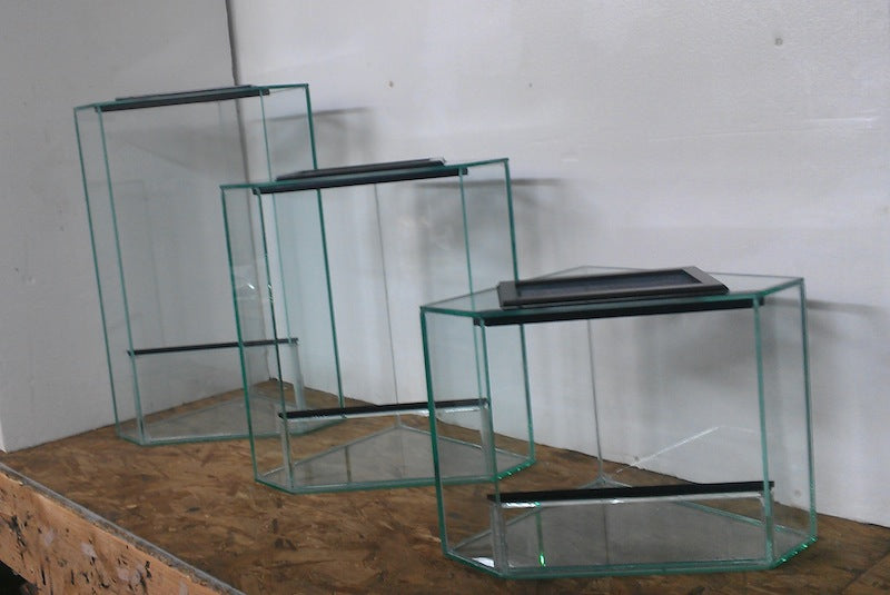 A space saving corner glass terrarium, this 12"x12"x24" is designed to be used as a single unit in corners or as four units together to create a stunning column effect with clear viewing from all angles. This size is ideal for multiple species of frogs, geckos, lizards, and snakes. Tall substrate barrier allows for water section or deep natural filtration layer. Substrate Dam- 6". The standard style of screen top is for use with a majority of reptiles. Dendro-Style comes with a 3-5″ screen top for ventilation set 2″ from the front of the terrarium to reduce humidity loss for humidity sensitive species. Misting and drainage holes can be drilled for an additional charge. Hand made in Maine USA.