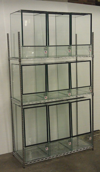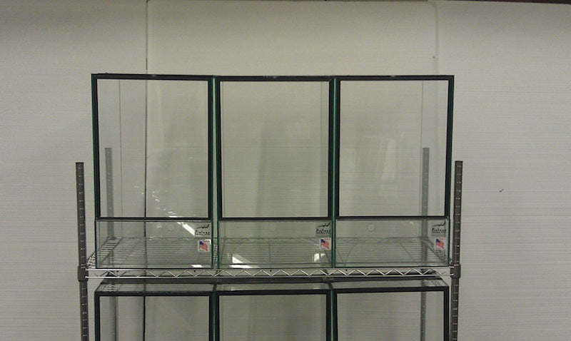 These tanks are designed to fit 48" x 18" Baker's Rack, three 15"x17"x24" reptile terrariums will fit on a single shelf. The standard style of screen top is for use with a majority of reptiles. Dendro-Style comes with a 3-5″ screen top for ventilation set 2″ from the front of the terrarium to reduce humidity loss for humidity sensitive species. Misting and drainage holes can be drilled for an additional charge. Hand-made in Maine, USA.