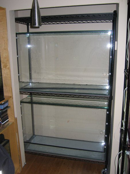 Designed for use on a 48" x 18" footprint Baker’s or Metro Rack system, the 44″x17″x 36″ fits a single glass terrarium per shelf for a neat, orderly look. This terrarium comes with a 3/8" thick bottom panel for extra strength and stability. Ideal for many frogs, especially breeding groups of dart frogs. The standard style of screen top is for use with a majority of reptiles. Dendro-Style comes with a 3-5″ screen top for ventilation set 2″ from the front of the terrarium to reduce humidity loss for humidity sensitive species. Misting and drainage holes can be drilled for an additional charge. Hand made in Maine, USA.